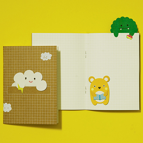 a clever notebook with a retro, craft cover and three monster bookmarks. This treetop trio includes a cloud, a tree and cheeky chappy Ricecracker.