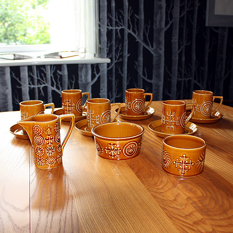 an earth coloured Portmeirion 'Totem' coffee cups and saucers (5) jug and sugar bowl.